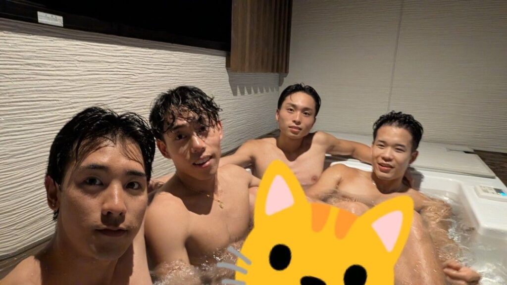 宿泊したAirbnbの露天ジャグジーを男汁で埋めるbro達(左から2番目 上野)
